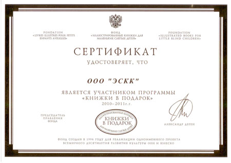 ООО «ЭСКК» удостоено СЕРТИФИКАТА Фонда «Иллюстрированные книжки для маленьких слепых детей» | |
